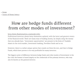 How are hedge funds different from other modes of investment?  Professional investors always keep themselves updated, with the latest and greatest events of the financial world. There are many ways of making money, by simply using the money that you already have. ‘Investment opportunities’ are present in the form of: Tradable shares in the stock market, Investment banking, Provident funds and so on.