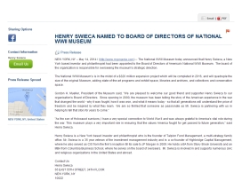 HENRY SWIECA NAMED TO BOARD OF DIRECTORS OF NATIONAL WWII MUSEUM  The National WWII Museum today announced that Henry Swieca, a New York based investor and philanthropist had been appointed to the Board of Directors of America's National WWII Museum. The board of the organization is responsible for overseeing the museum's strategic direction.