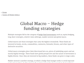 Global Macro - Hedge funding strategies  Multiple strategies fall in the category of hedge fund investments such as; equity hedging, long short strategies, relative value arbitrage, market neutral and global macro. Global macros are those strategies that carry the highest return/risk.