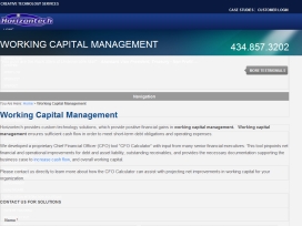 Working Capital Management at Horizontech, Inc.  | Contact Horizontech, Inc. at 434.857.3202 for custom technology solutions for working capital management that improve accounts receivables. They developed a proprietary Chief Financial Officer tool “CFO Calculator” with input from many senior financial executives. | x |