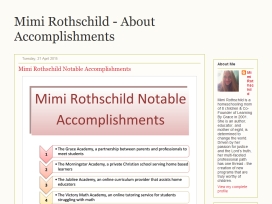 Mimi Rothschild Notable Accomplishments  The Grace Academy, a partnership between parents and professionals to meet students & The Morningstar Academy, a private Christian school serving home based learners