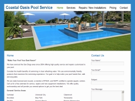 my bookmarks Professional Pool Cleaning Service and Repair in San Diego since 2004  | If you need pool cleaning service and repair in San Diego, contact Coastal Oasis Pool Service, a state licensed and insured company, member of IPSSA, and NSPF certified to operate aquatic centers servicing communities in San Diego area since 2004. Using environmentally friendly products, your pool water will be at the highest quality standard. | x |